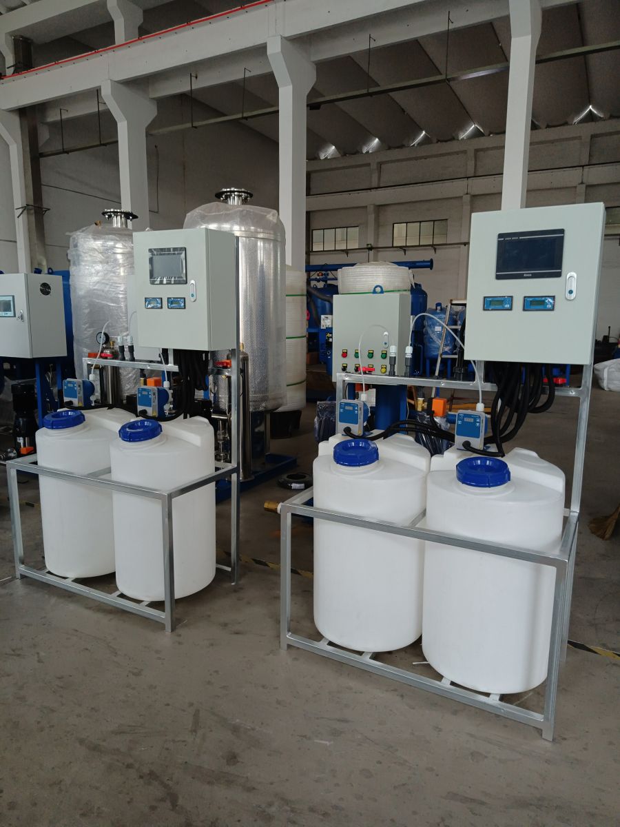 全自動加藥裝置采用時間程序控制,此控制方式無需儀表的支持,首先根據(jù)系統(tǒng)的運轉(zhuǎn)需要設(shè)定自動加藥的周期、加藥量、加藥時間和加藥頻率。在以后的系統(tǒng)運轉(zhuǎn)過程中,到加藥周期,計量泵自動打開加藥,加到規(guī)定的時間計量泵關(guān)閉;到排污周期,計量泵停止加藥,排到規(guī)定的時間后,計量泵繼續(xù)開啟,補充排污損失掉的藥劑,把系統(tǒng)的含藥量維持在正常的水平、加到規(guī)定的時間計量泵關(guān)閉。