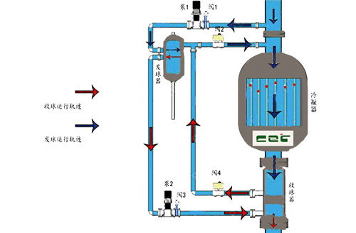 設(shè)備采用物理清洗方法,將清洗膠球從發(fā)球器發(fā)送到冷凝器進水端,膠球隨著水流進入每根換熱管,依靠水壓差擦洗換熱管內(nèi)壁。膠球在冷卻水回水端隨著水流進入收球器內(nèi),再將膠球回收至發(fā)球器內(nèi),完成一次清洗循環(huán)。